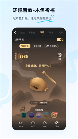 此外,目前已超过3.7亿人使用的蝰蛇音效,近期又推出了全新产品——虚拟环境音效。该音效提供晴朗夜空、风雨时刻、海边休闲三种场景音,在设置界面还允许用户对不同场景内的细节进行微调,开启后可以为歌曲融入一层自然的环境音,给乐迷带来身临其境的效果。