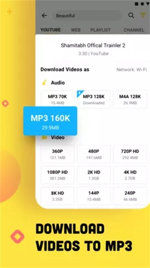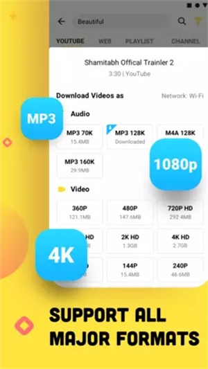 SnapTube Pro解锁版会员版支持多种分辨率的mp4视频下载,比如:360P、480P、720P、1080P高清等等,用户也可以任意下载任何YouTube音乐视频直接作为MP3格式文件。进而满足您的播放需求,随时听你喜欢的音乐视频。