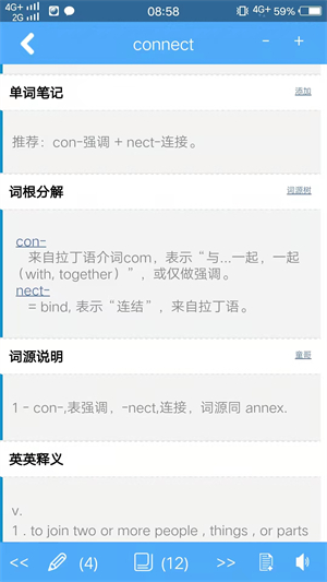3、接着是词根记忆,和词源说明。会告诉你这个单词中包含的词根和词缀,词源说了它的来历更加让人记忆深刻。