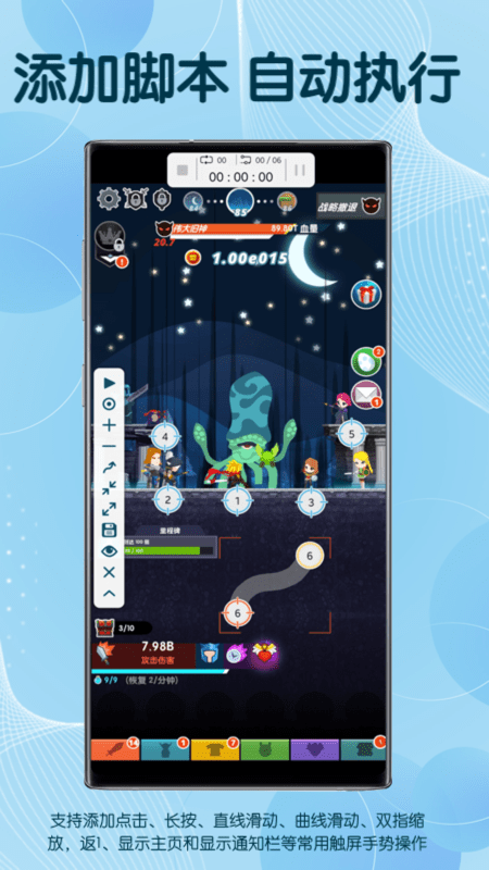 图灵自动点击器,可以根据用户的设置自动执行屏幕手势操作,包含了点击、长按、连点、直线滑动、曲线滑动、双指缩放、返回、显示主页和显示通知栏等常用触屏手势操作功能。您也可以轻松录制自己的手势,添加自定义操作,定时执行任务。它可以解放您的双手,帮您做重复的手机屏幕操作任务。