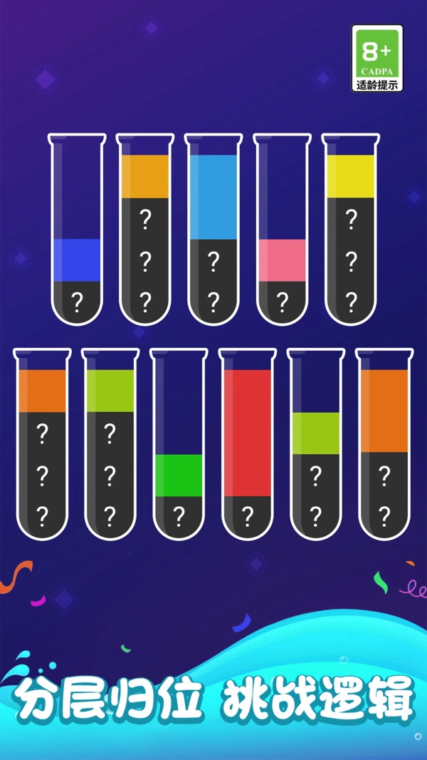 1. 菜到极致巧妙地把色彩液体排序和益智解谜进行了完美融合,玩家需要凭借清晰的逻辑思维,将同色液体准确无误地完成分类。