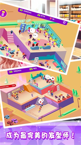 美容美发城市客厅是一款极富创意的模拟经营游戏。在游戏里,玩家汇聚于此,经营一家专属于自己的美容店。每天,玩家都会迎来形形色色的顾客,需要迅速完成一系列任务。玩家要通过运用不同的经营方式,把店铺经营得更好。历经不断的挑战,玩家能快速提升自身的美容技术。