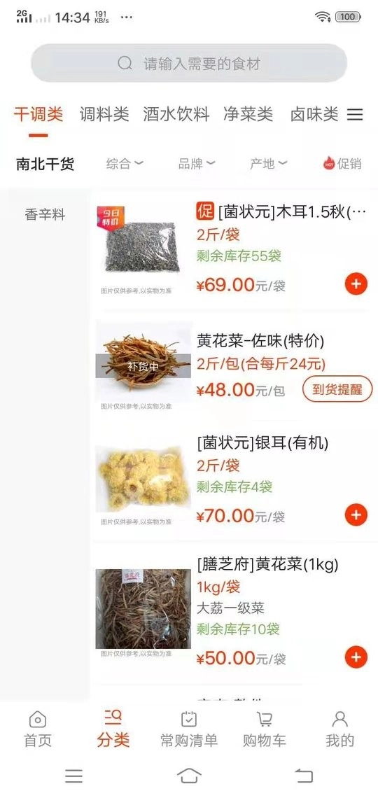 2、便捷线上浏览:支持在线浏览,查找所需生鲜。调料、蔬菜、鲜肉、米面粮油等各类食材分类明晰,用户能够迅速找到目标商品。