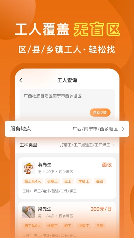 查看详情页掌握工人的工种、工作经验等信息挑选工人;