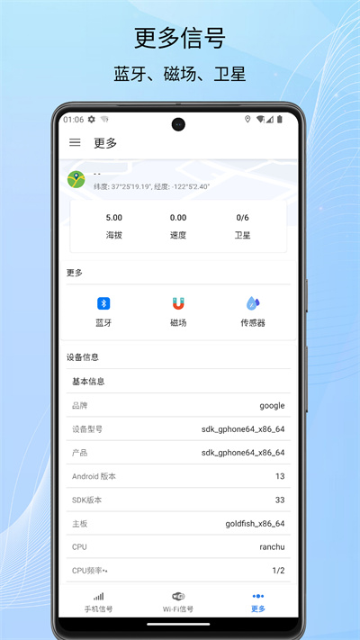 信号检测仪是一款用于信号检测的工具,借助这款软件,我们能够对手机型号展开检测处理。它具备丰富多样的信号检测功能,涵盖手机信号、WiFi信号、GPS信号、蓝牙信号等各类检测服务,足以满足大家的检测使用需求。
