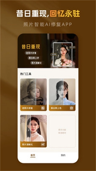 昔日重现是一款极为专业且实用的手机免费一键修复老照片的图片编辑软件。这款昔日重现修复老照片的最新版软件,依托原创AI图像生成技术精心打造,为用户带来智能的AI在线照片画质修复功能。其操作极为简便,极易上手,用户仅需选择上传破损、模糊的老照片,提交处理后,就能轻松收获修复好的照片。