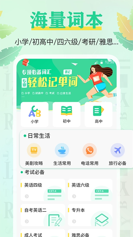 四六级记单词,一款备受青睐的专业且趣味十足的记单词软件。它专注于帮您攻克背单词这一难关,助力您轻松踏上英语学习之路。该软件所涉词汇种类丰富,包含小学、初中、高中词汇,英语四六级词汇,自考英语二精选词汇,还有考研、雅思、托福等各类词汇,助您毫无压力地完成不同阶段英语词汇的学习。