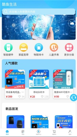 第一步:打开酷鱼生活,能够看到可以购买的智能硬件、物联网卡、儿童手表和家庭宽带等。