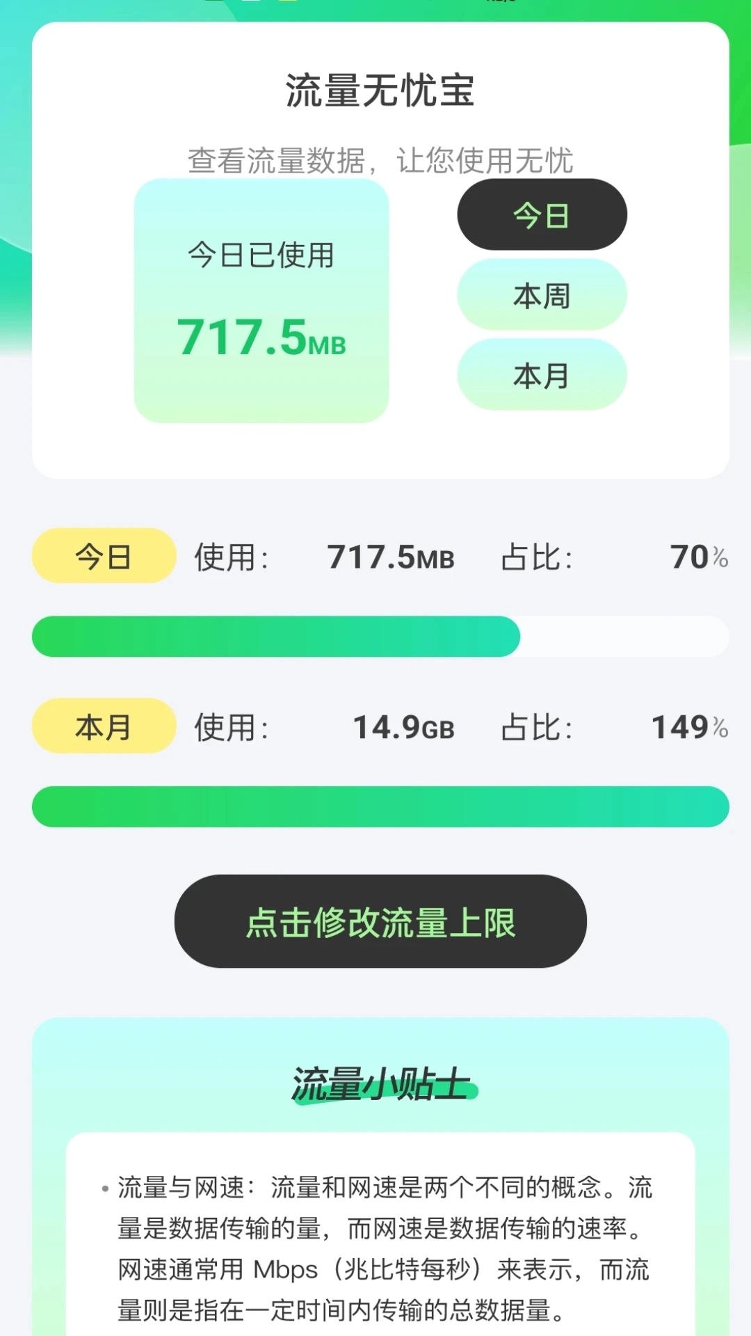 3、流量预测:根据用户的历史数据使用情况,智能预测用户近期可能使用的流量,并给出相应的提示。
