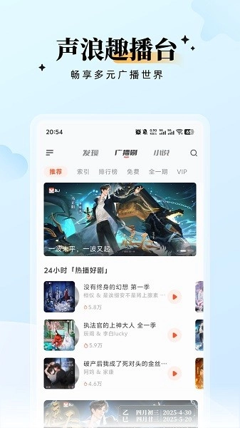在热播好剧里选好广播剧后,点击播放按钮就能开始收听,还能自行调节播放进度和音量。